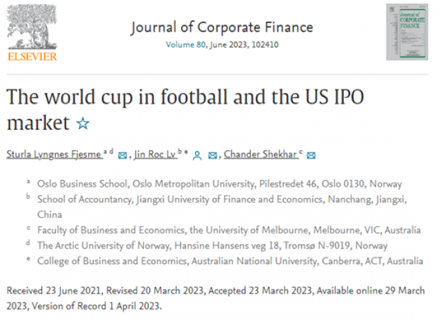 Recently, Dr. Lv Jinpeng from the School of Accountancy had his research paper titled The world cup in football and the US IPO market accepted and published online by the international authoritative journal of finance, Journal of Corporate Finance. Lv Jinpeng is the joint first author of the paper and corresponding author, with all authors sorted by the first letter of their surnames. Collaborators include Sturla Lyngnes Fjesme from Oslo Metropolitan University and Professor Chander Shekhar from the University of Melbourne.