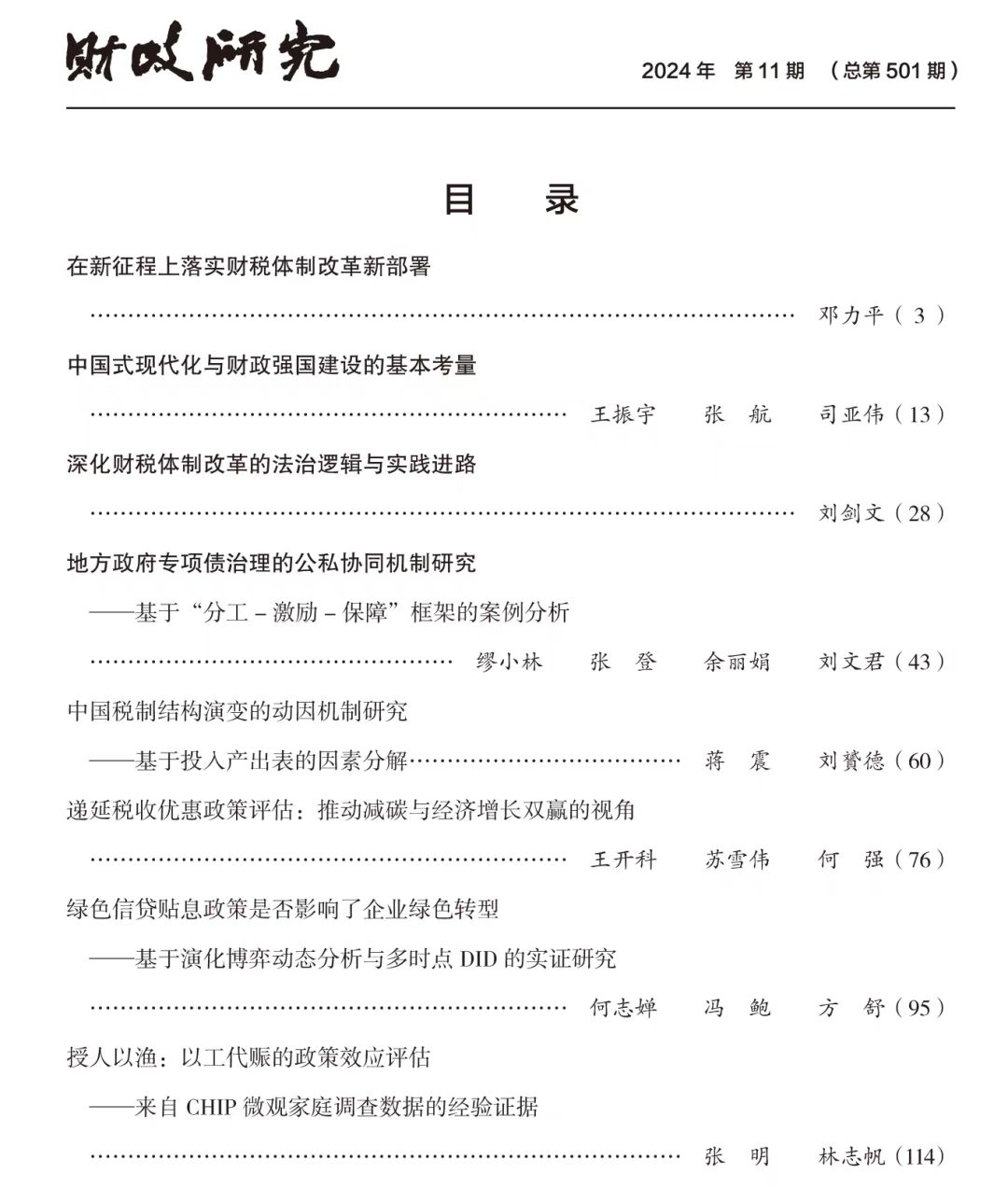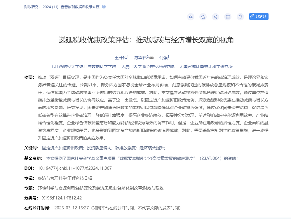 Recently, Professor Wang Kaike of the School of Statistics and Data Science, Su Xuewei, PhD candidate of the Zou Zhizhuang Economic Research Institute of Xiamen University, and He Qiang, researcher of the Institute of Statistical Science of the National Bureau of Statistics,published the paper "Evaluation of Deferred tax preferential Policies: Promoting the win-win perspective of carbon reduction and economic growth"in the authoritative Chinese A-journal "Fiscal Research", No. 11, 2024.
