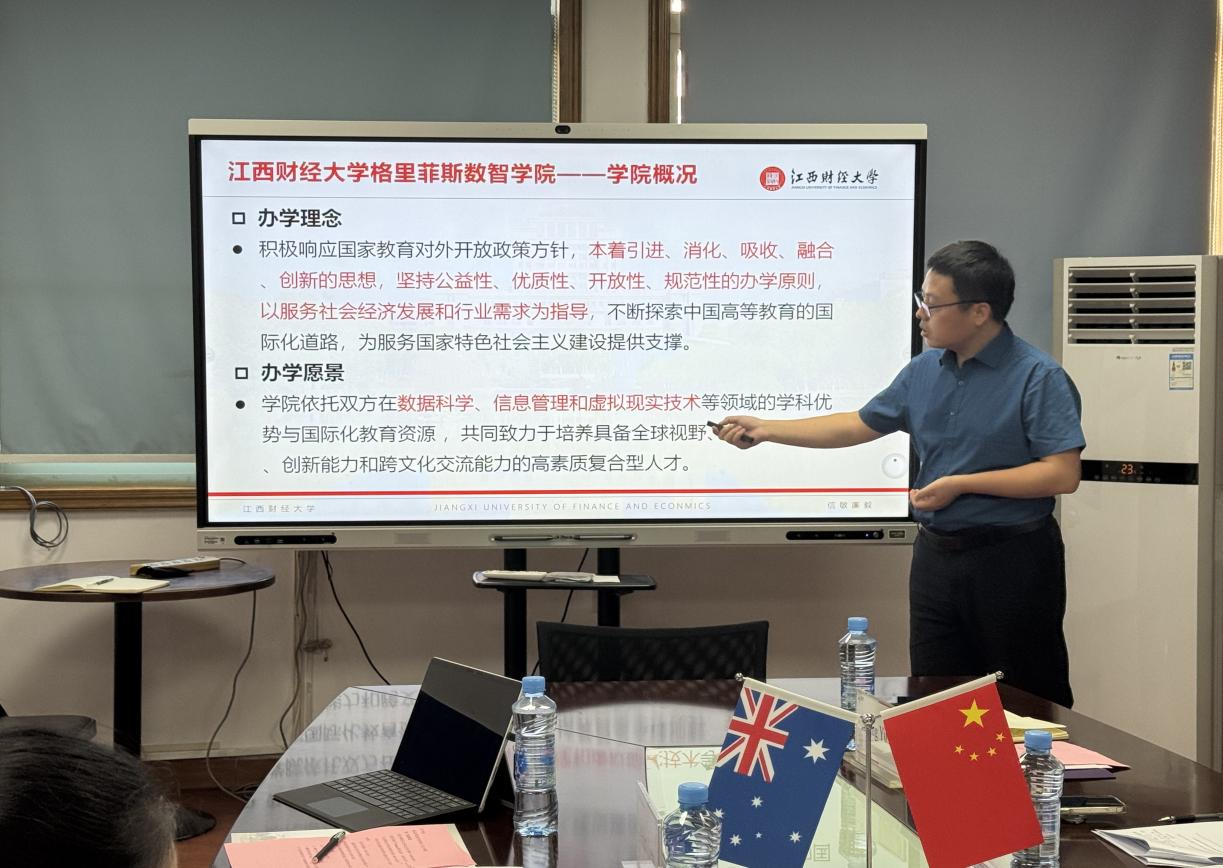 Yuan Honglin extended a warm welcome to the Griffith University delegation and briefly reviewed and summarized the exchanges and cooperation between the two universities. He emphasized that JUFE attaches great importance to educational collaboration with Griffith University. The newly approved Digital Intelligence School represents a "breakthrough" in having no Sino-foreign cooperatively-run school in Jiangxi's higher education sector. He expressed hope that, by leveraging the Digital Intelligence School, the two universities would integrate high-quality resources, boldly reform and innovate, and strive to build it into a new growth point for JUFE's development, a demonstration zone for cultivating international talents, and a Jiangxi model for local universities engaging in international education.