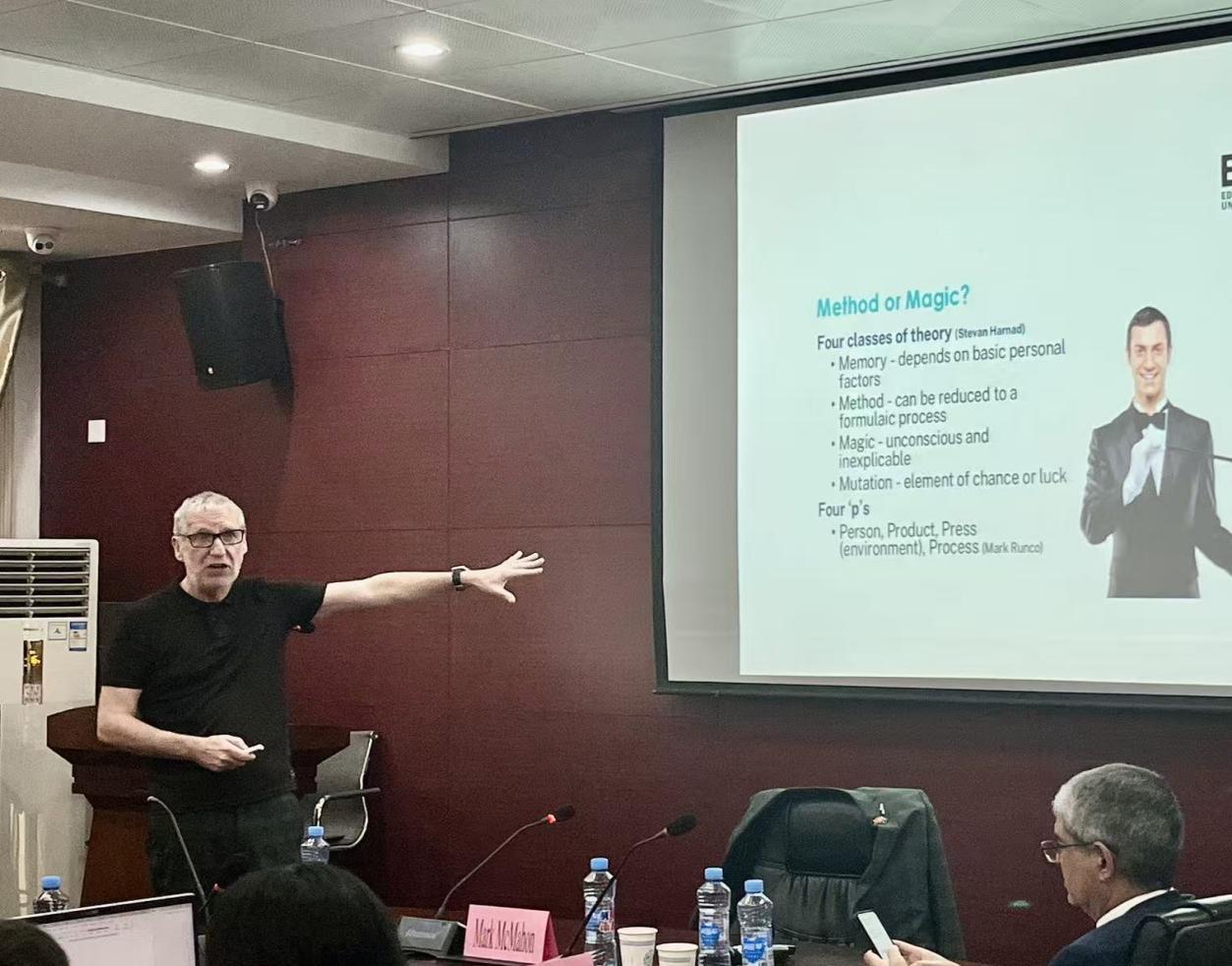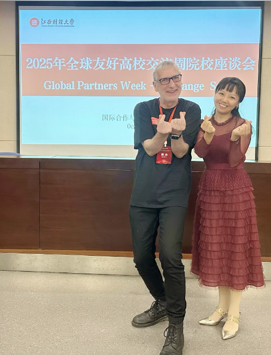 During the exchange event, Professor Mark McMahon, a core member of the Edith Cowan University delegation and Director of International Strategy at the ECU's and the faculty of School of Arts and Humanities, delivered a keynote address titled "Innovation in the Age of AI." He provided an in-depth analysis of artificial intelligence's impact on the creative industries and education sector. He emphasized that AI has evolved from a "future concept" into a "present-day tool." In creative fields, AI does not replace human creativity but enhances the creative process through human-machine collaboration—for instance, leveraging cutting-edge AI tools to boost creative efficiency and expand creative boundaries. He further stressed that uniquely human qualities such as empathy, intuition, and imagination remain irreplaceable core competencies. This perspective resonated strongly with JUFE the School of Sociology and Humanities' goal of "cultivating talents with both humanistic literacy and innovative capabilities," sparking lively discussions among faculty and students in attendance.