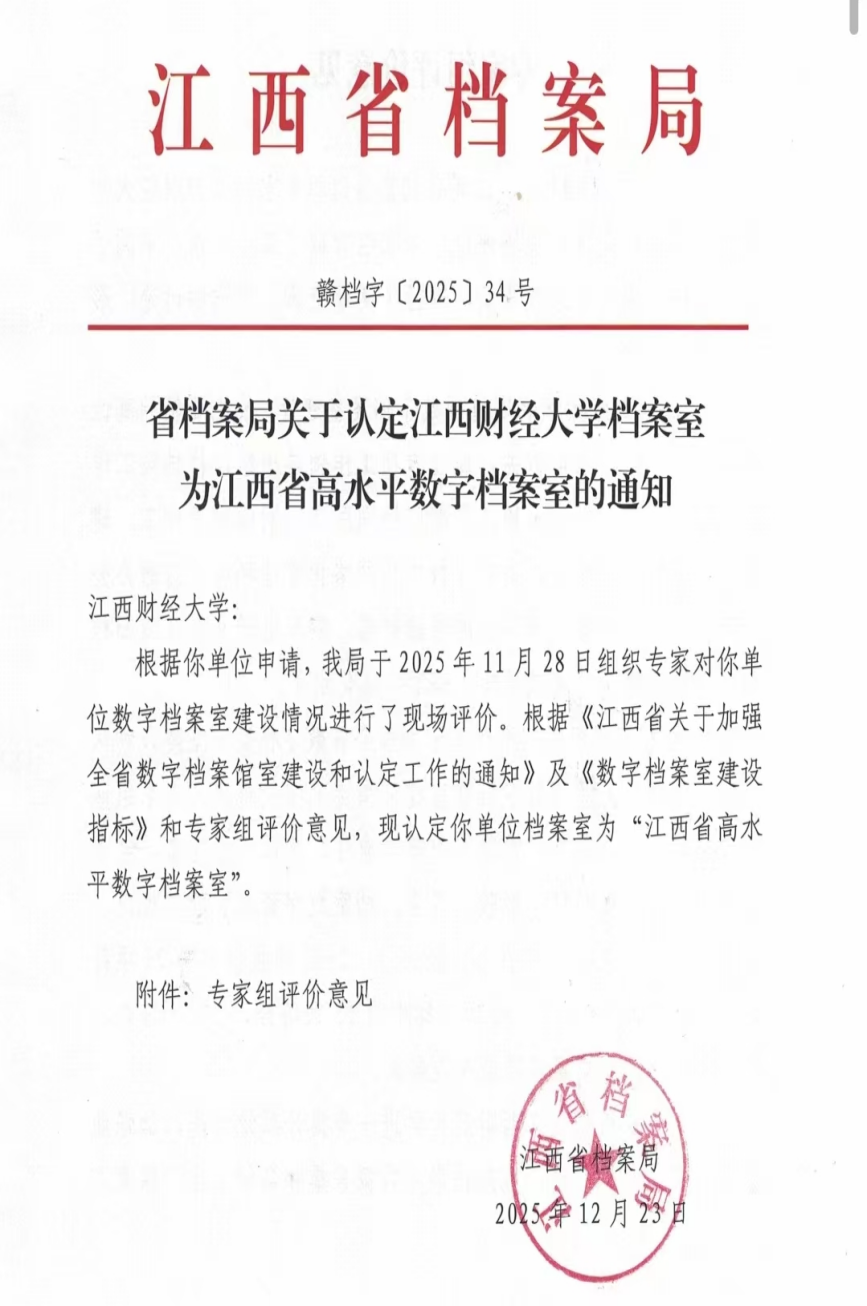 On December 23, the Jiangxi Provincial Archives Bureau issued the Notice on Recognizing the Archives Office of Jiangxi University of Finance and Economics as a High-Level Digital Archives Office of Jiangxi Province, formally recognizing JUFE's Archives Office as a "High-Level Digital Archives Office of Jiangxi Province." This makes JUFE the first university in Jiangxi Province to receive this high-level digital archives designation following the issuance of the Measures for Promoting the Construction of Digital Archives Offices in Government Agencies (Trial) (Document No. 7 [2024]) by the National Archives Administration of China. Consequently, JUFE has become the only university in the province to concurrently hold both the title of "Provincial Special-Class Unit for Standardized Archives Management" and "High-Level Digital Archives Office of Jiangxi Province."