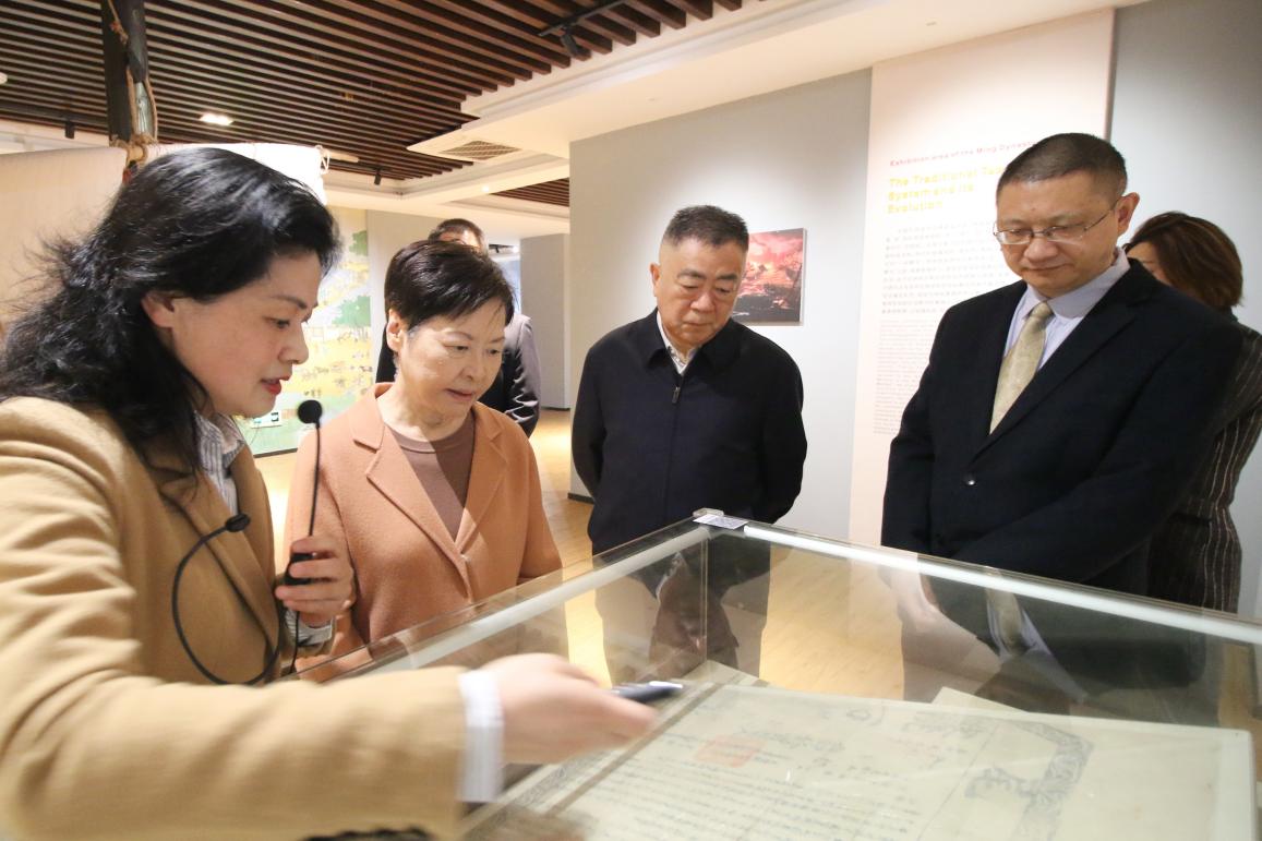 Prior to the lecture, Ms. Carrie Lam visited the JUFE's History Museum and the China Tax Receipt Museum, where she gained an in-depth understanding of the development history and current progress of JUFE.