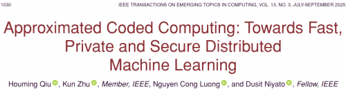 Achievement 2: Approximated Coded Computing: Towards Fast, Private and Secure Distributed Machine Learning.Published in 《IEEE Transactions on Emerging Topics in Computing》in April 2025, the study titled《Approximated Coded Computing:Towards Fast, Private and Secure Distributed Machine Learning》 proposes a fast, secure, and privacy-preserving approximated coded distributed computing scheme. This scheme employs a novel encryption algorithm based on elliptic curve cryptography to ensure data security during transmission. In particular, it does not impose a strict limit on the minimum number of results required to wait for. Furthermore, the scheme can effectively overcome straggler nodes in the system, ensuring that tasks are executed without interference. Meanwhile, by applying random data during the encoding phase, the scheme guarantees that the original data is not disclosed, while successfully decoding the original results during the decoding phase. Finally, deep neural networks built upon the proposed coding scheme achieve a significant improvement in convergence speed over baseline methods. This research not only addresses the strict limitations of traditional coding schemes on recovery thresholds in the design of coding schemes, but also exhibits strong resilience against straggler nodes, colluding nodes, and eavesdroppers during transmission in distributed systems. Its significant advantages in the field of distributed machine learning are expected to see widespread application.