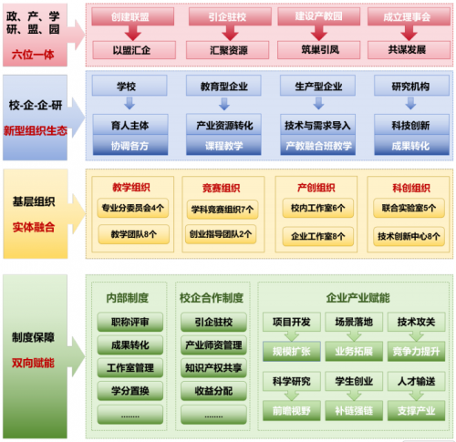 Focusing on the entire process of talent cultivation and industrial innovation, the college has top-down constructed a matrix of 48 grassroots collaborative organizations covering teaching development, technological innovation, industrial innovation, and concept verification.